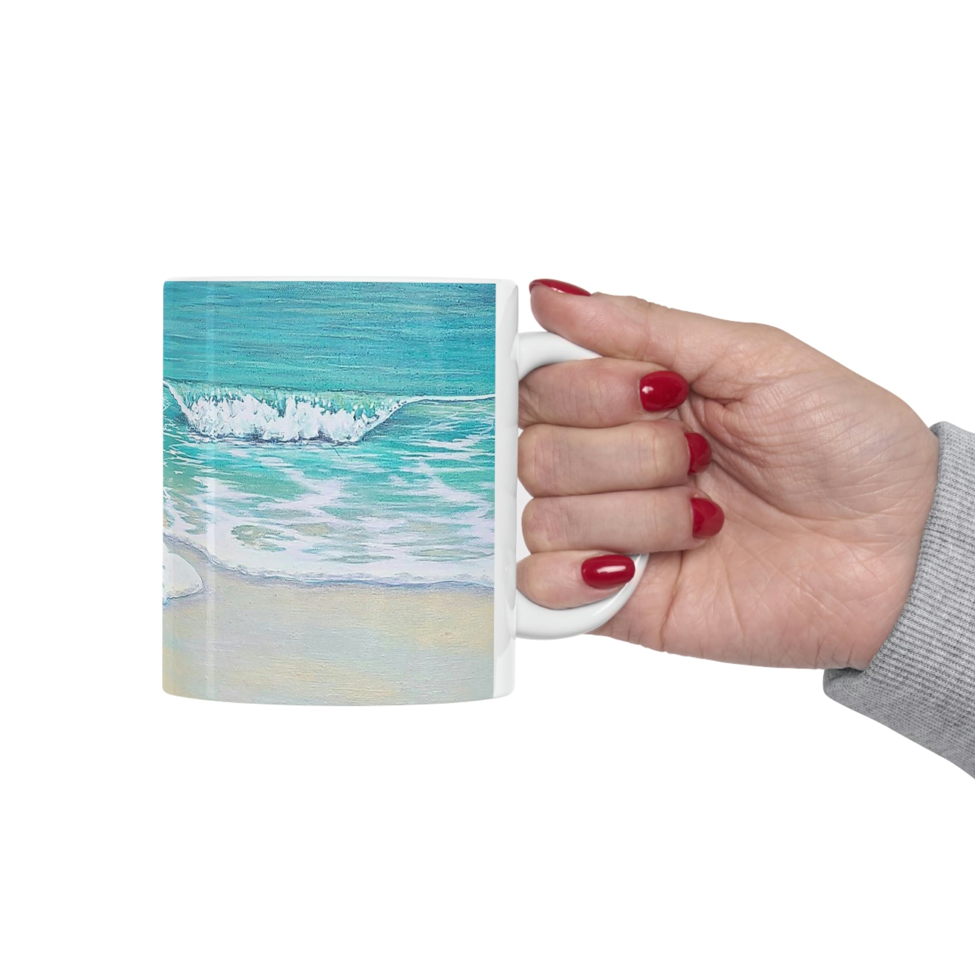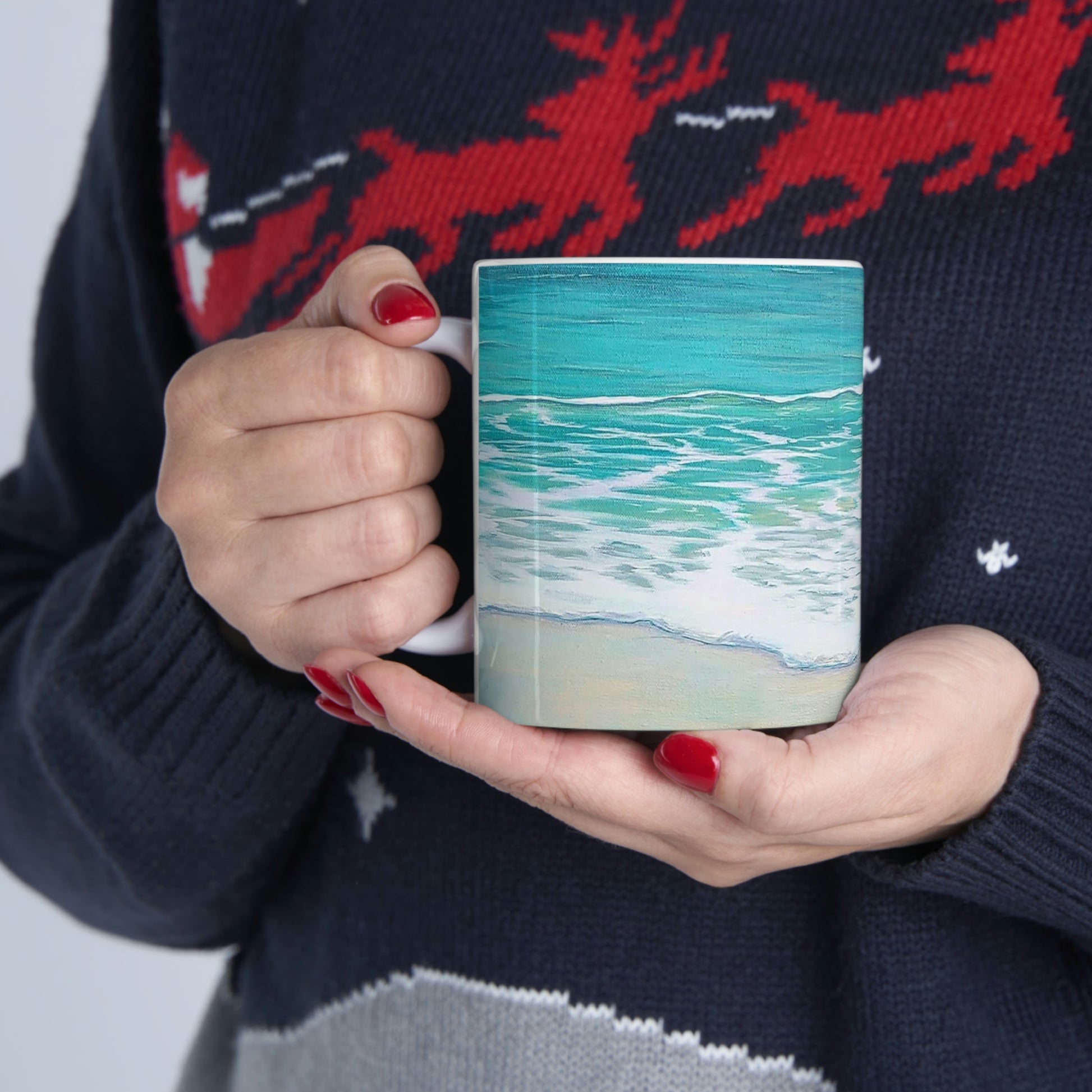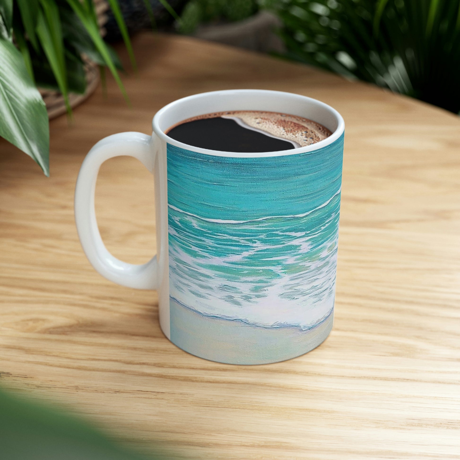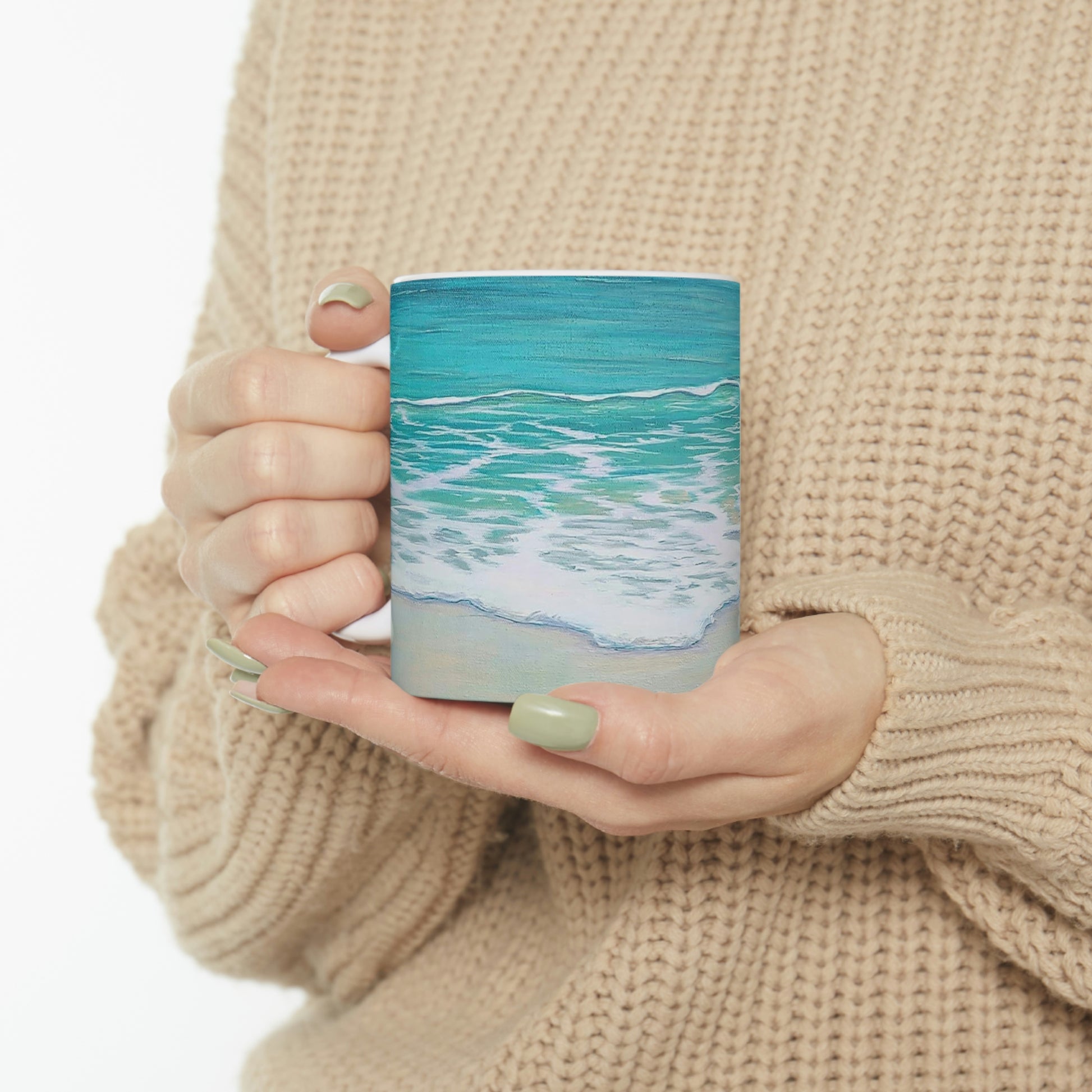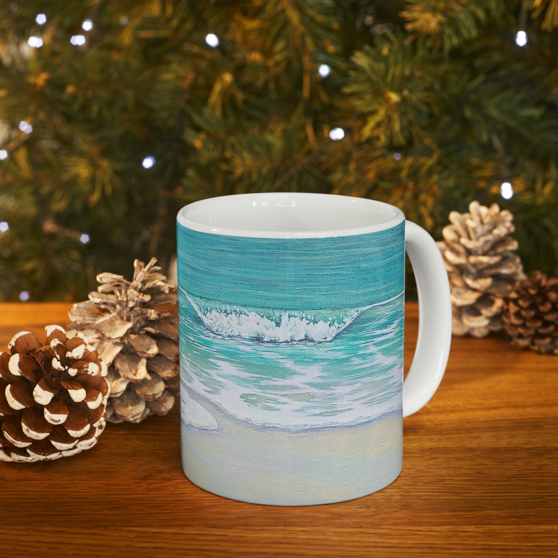 Warm-up with a nice cuppa from your Beach Wave ceramic mug. The images on the mug comes from my original acrylic painting "Sunset on the Beach". High quality printing captures the texture of the canvas and brushstrokes on the original. The mugs are BPA and Lead-free, microwave & dishwasher-safe, and made of white, durable ceramic in an 11-ounce size. incredibly vivid colors