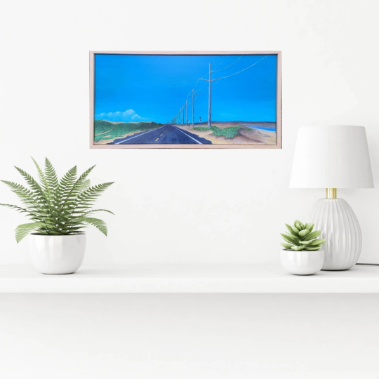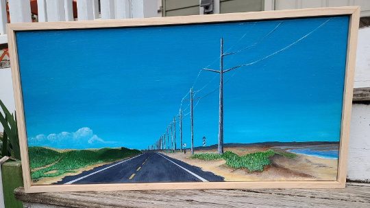 Original is acrylic on canvas. Canvas is 12x24 and includes a handmade pine frame.