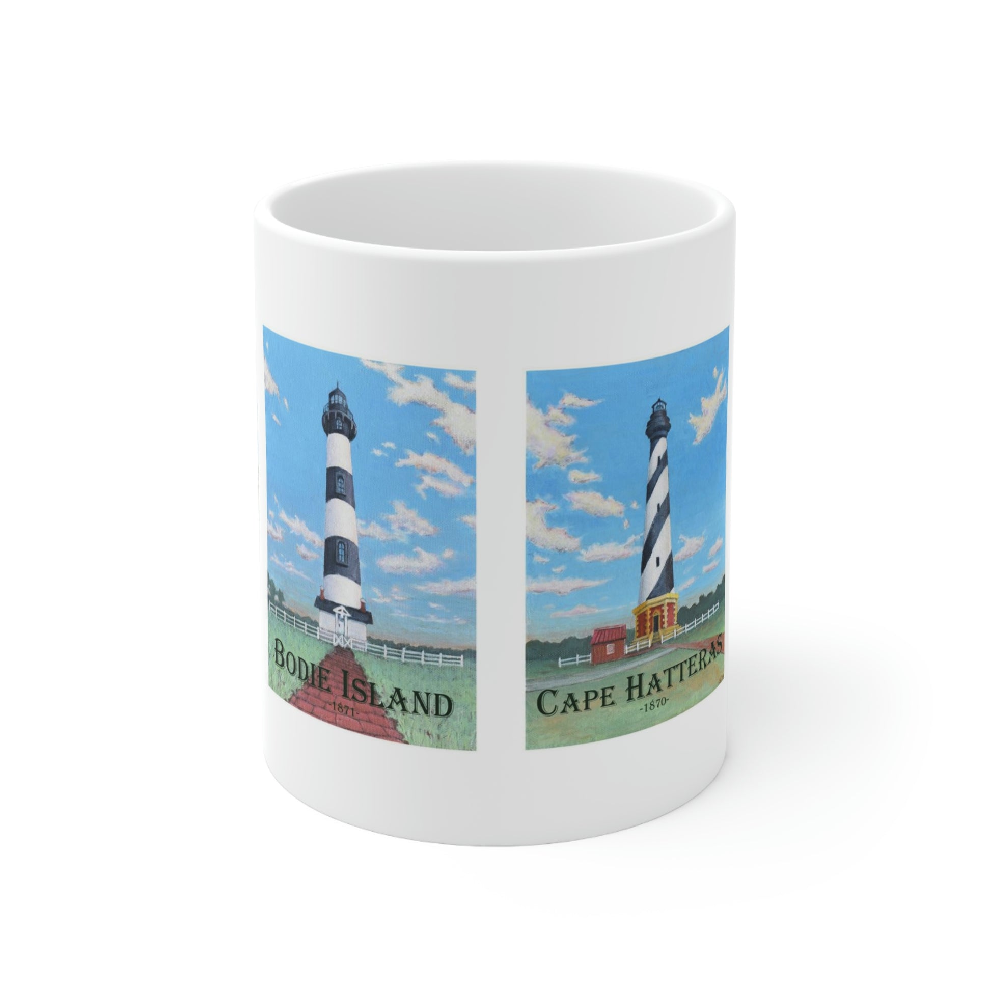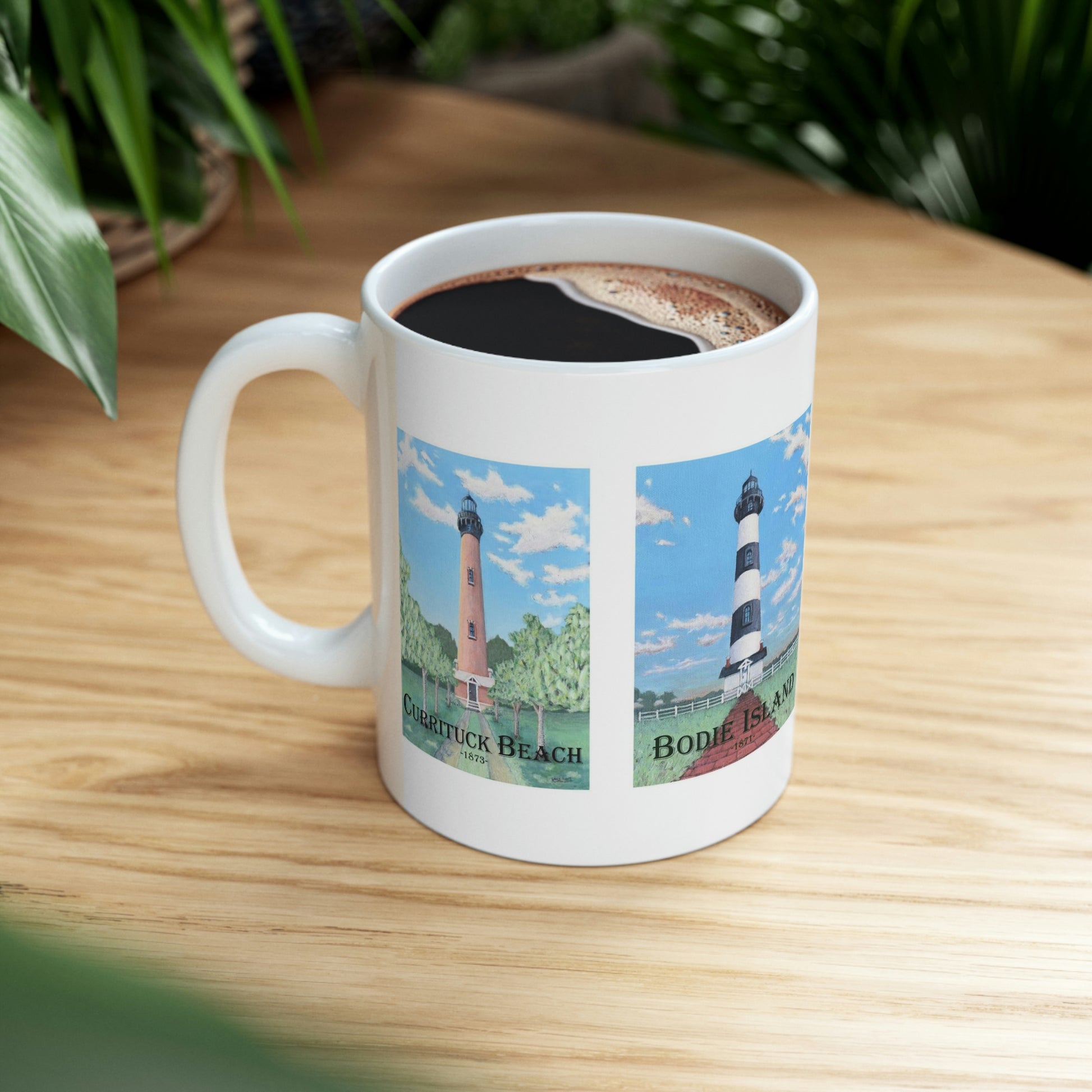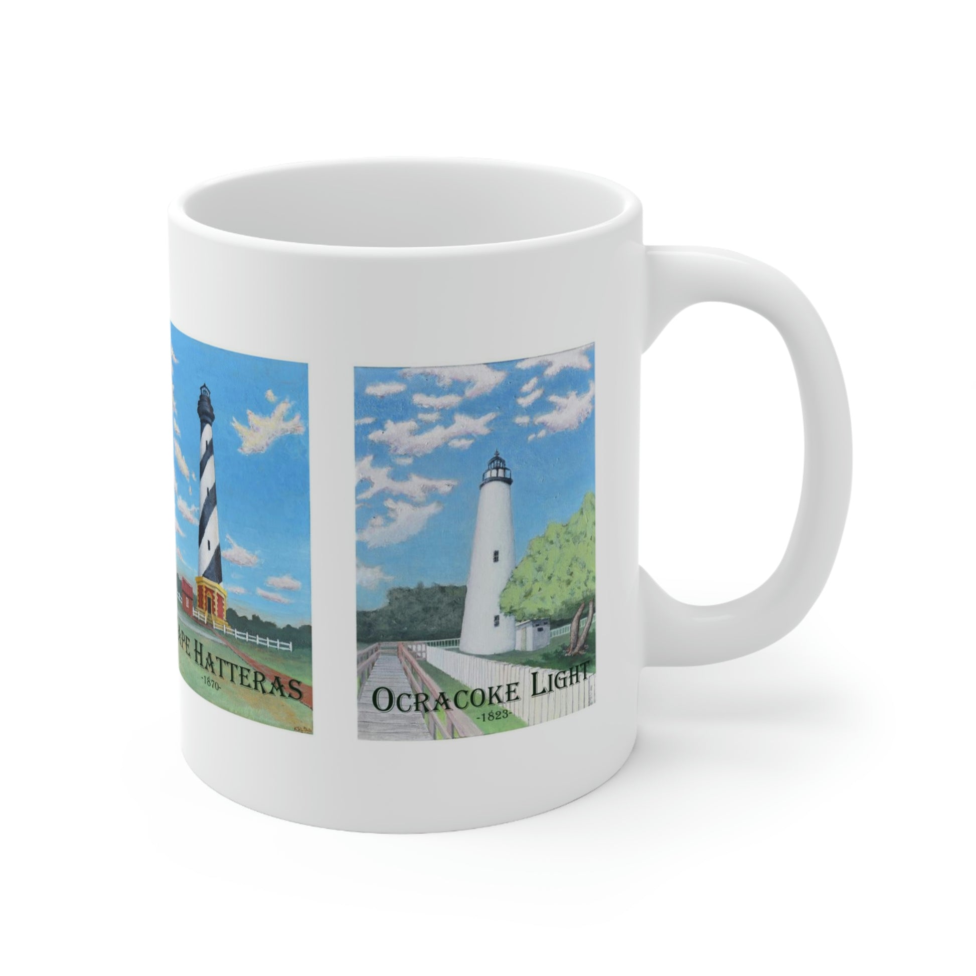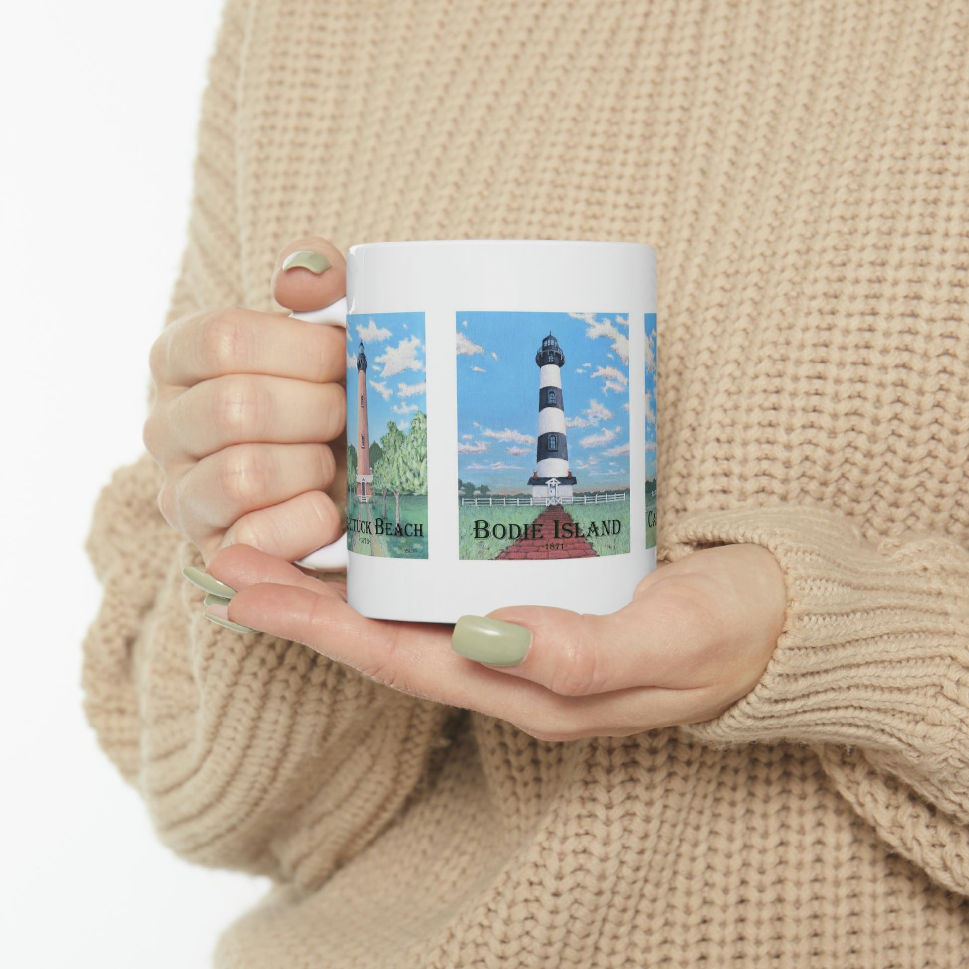 Warm-up with a nice cuppa from your Outer Banks Lighthouse ceramic mug. The images on the mugs come from 4 of my original paintings. Currituck Lighthouse, Bodie Island Lighthouse, Cape Hatteras Lighthouse, Ocracoke Lighthouse. High quality printing captures the texture of the canvas and brushstrokes on the originals. The mugs are BPA and Lead-free, microwave & dishwasher-safe, and made of white, durable ceramic in an 11-ounce size. incredibly vivid colors