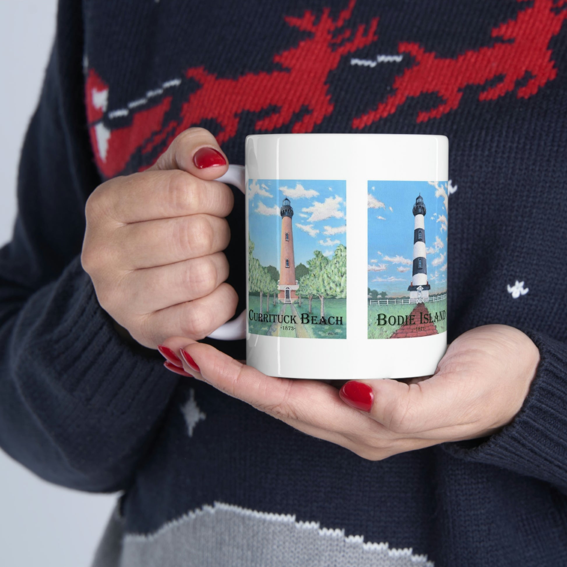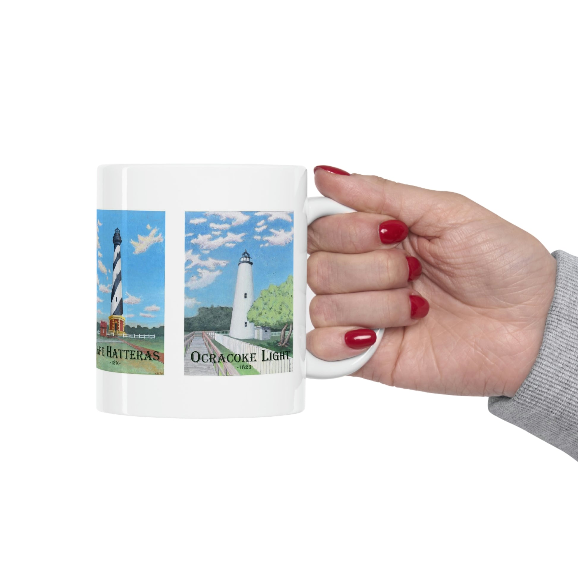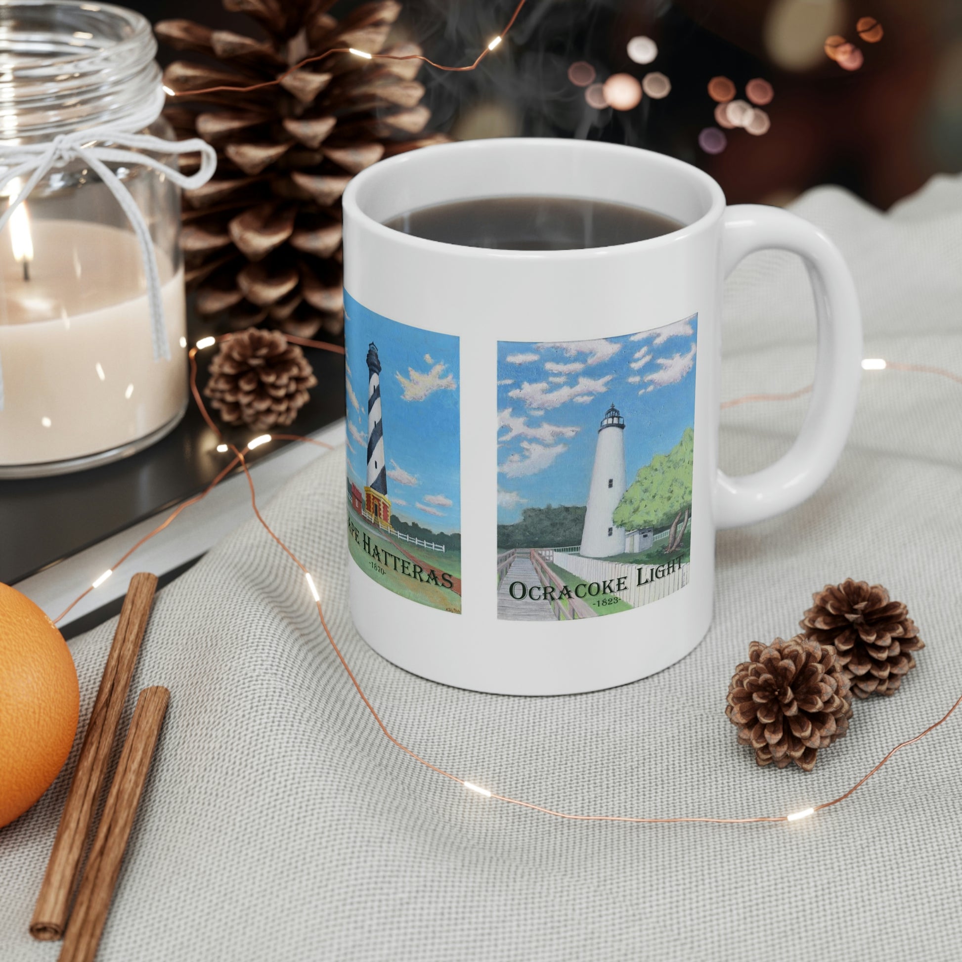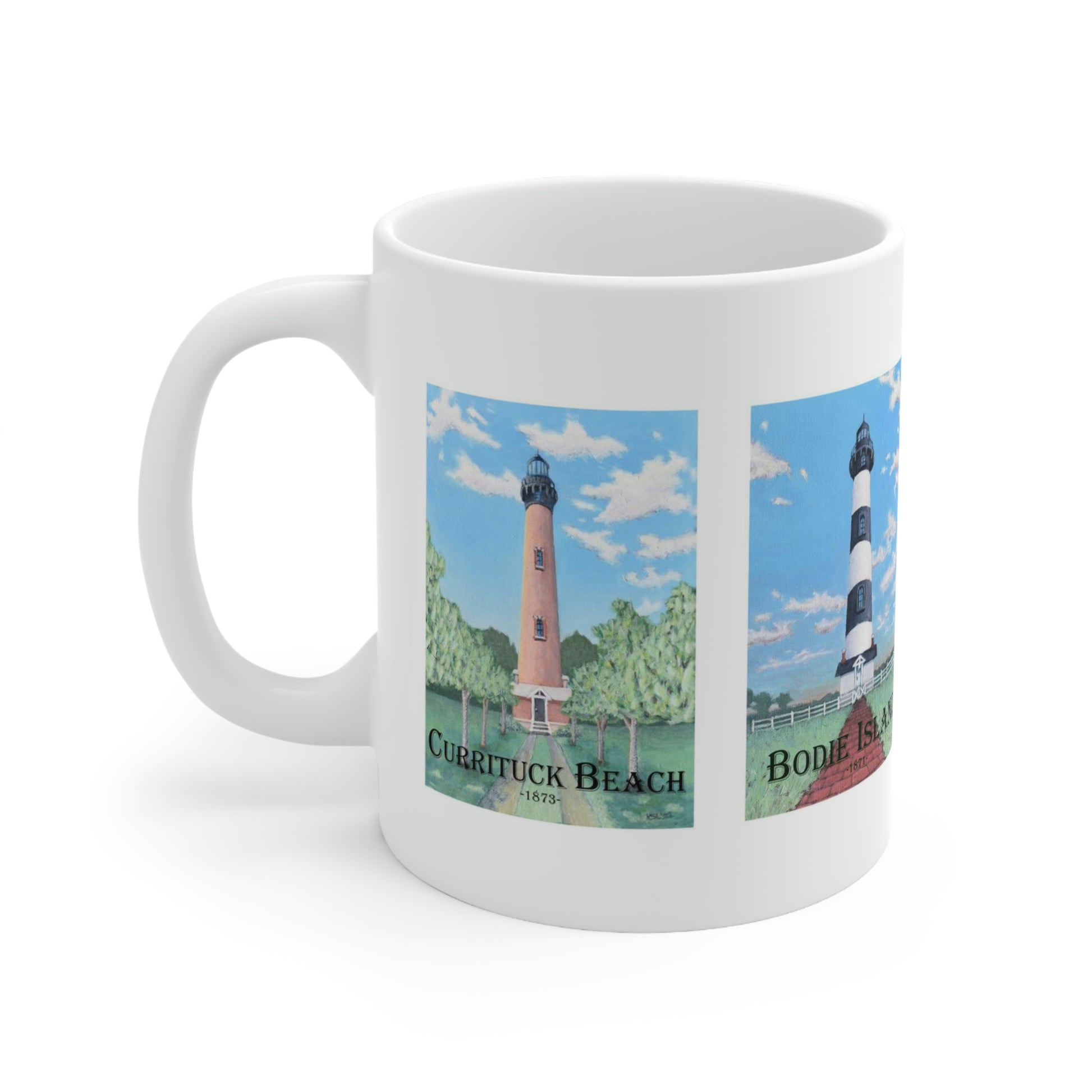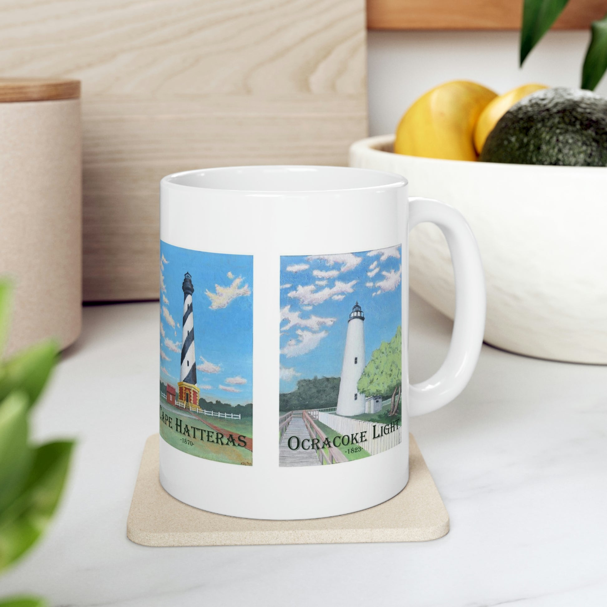 Warm-up with a nice cuppa from your Outer Banks Lighthouse ceramic mug. The images on the mugs come from 4 of my original paintings. Currituck Lighthouse, Bodie Island Lighthouse, Cape Hatteras Lighthouse, Ocracoke Lighthouse. High quality printing captures the texture of the canvas and brushstrokes on the originals. The mugs are BPA and Lead-free, microwave & dishwasher-safe, and made of white, durable ceramic in an 11-ounce size. incredibly vivid colors
